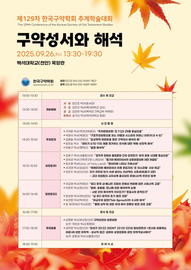 제129차 한국구약학회 추계학술대회 페이지 정보 작성자 구약학회 (221.♡.113.236) 댓글 댓글 0건 조회Hit 224회 작성일Date 25-12-09 15:27 본문 . 추천0 비추천0 목록 이전글제130차 한국구약학회 송년 학술대회 25.12.09 다음글제128차 한국구약학회 춘계학술대회 25.12.09 댓글 0 댓글목록 등록된 댓글이 없습니다.