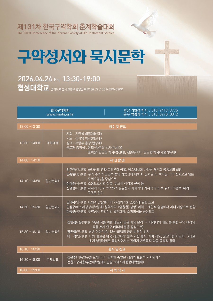 돌아오는 4월 24일(금) 오후 1시 30분-7시, 협성대학교에서 "구약성서와 묵시문학"이라는 주제로 131차 한국구약학회 춘계학술대회를 진행하고자 하오니 학회원분들의 많은 관심과 참여 부탁드립니다.